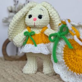 Սիրուն ձեռագործ հավաքածու՝ նախատեսված փոքրիկների համար։ Փափուկ ու գրկելու համար հարմար նապաստակը հագած է գարնանային դեղին զգեստ, իսկ նրա կողքին է ձեռագործ «մարգարիտ» պայուսակը՝ կանաչ ժապավենով։ Հիանալի նվեր երեխայի կամ ֆոտոշարքի համար։