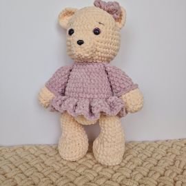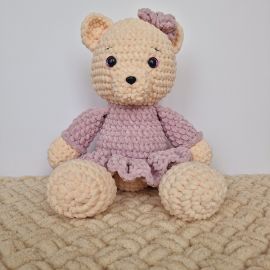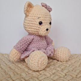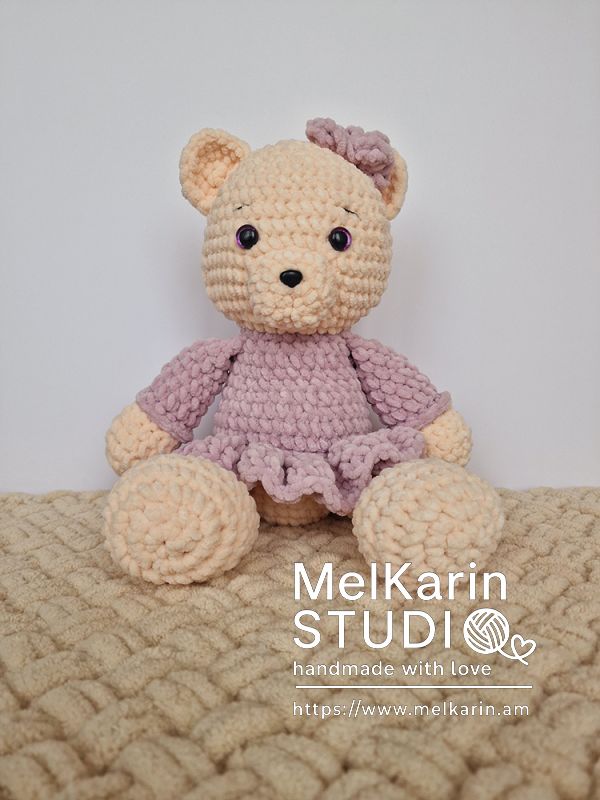 ԱվելացնելԱյս հմայիչ ծիրանագույն արջը յասամանագույն զգեստով հիանալի նվեր կլինի երեխաների և մեծահասակների համար, ինչպես նաև հիանալի դեկորատիվ տարր ձեր տանը: Ստեղծված սիրով և մանրուքների նկատմամբ ուշադրությամբ՝ խաղալիքը ձեռքի աշխատանք է, օգտագործելով բարձրորակ նյութեր՝ դարձնելով այն փափուկ, հարմարավետ և դիմացկուն: