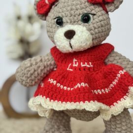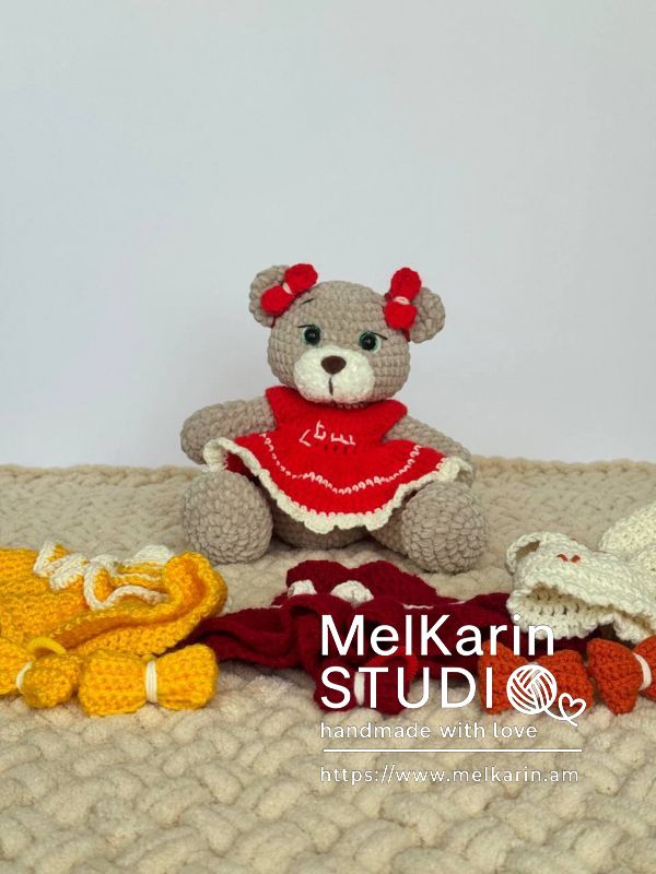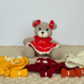 ԱվելացնելԱյս ձեռագործ արջուկը ոչ միայն հմայիչ է, այլև ունի մի քանի հագուստ՝ փոփոխելու համար։ Հագին ունի կարմիր զգեստ։ Բացի այդ, ներառված են մի քանի այլ զգեստներ՝ տարբեր գույներով, որոնք երեխան կարող է փոխել ըստ ցանկության։