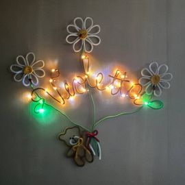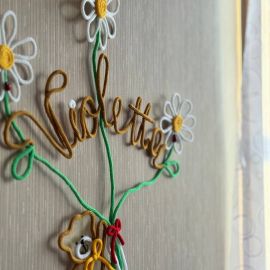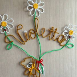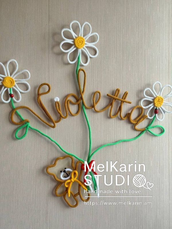 Այս գեղեցիկ պատային զարդը՝ Violetta անունով, ստեղծված է «տրիկոտին» տեխնիկայով՝ հատուկ փափուկ բամբակյա թելով պատված մետաղալարով։ Յուրաքանչյուր տարր՝ տառից մինչև ծաղիկ և արջուկ, հյուսված է ձեռքով, սիրով և ուշադրությամբ։ Կազմությունը համալրվում է երեք երազանքային