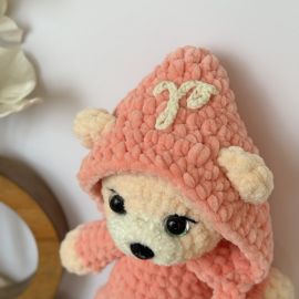 Очаровательный вязаный медвежонок ручной работы в уютном персиковом костюмчике с капюшоном. Создан из мягчайшей плюшевой пряжи, он станет прекрасным подарком для ребёнка или стильным элементом декора детской комнаты.