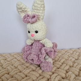 Этот очаровательный белый зайчик в сиреневом платье — настоящее воплощение уюта и волшебства. Вязанный с любовью и вниманием к каждой детали, зайчонок обладает мягкой текстурой и нежными, словно облако, ушками. Его платье, выполненное в оттенке нежного сиреневого,