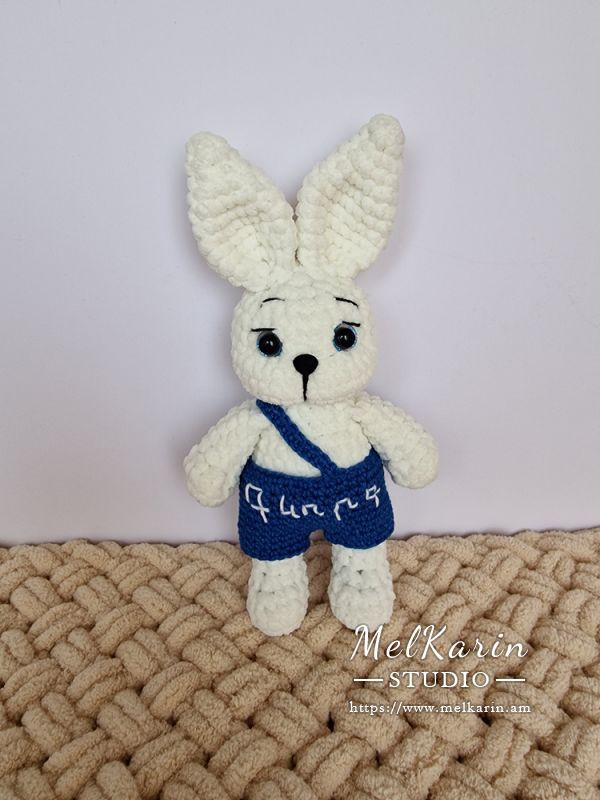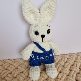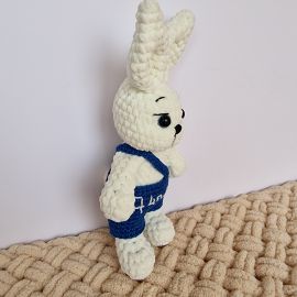 ДобавитьОчаровательный зайчик, связанный вручную из мягкой плюшевой пряжи, станет прекрасным подарком для ребенка или стильным элементом декора. Белоснежный пушистик одет в вязаные синие шортики на лямке с вышивкой, добавляющей индивидуальность и шарм. Большие выразительные глаза и трогательная мордочка делают этого зайку по-настоящему живым и любимым с первого взгляда.