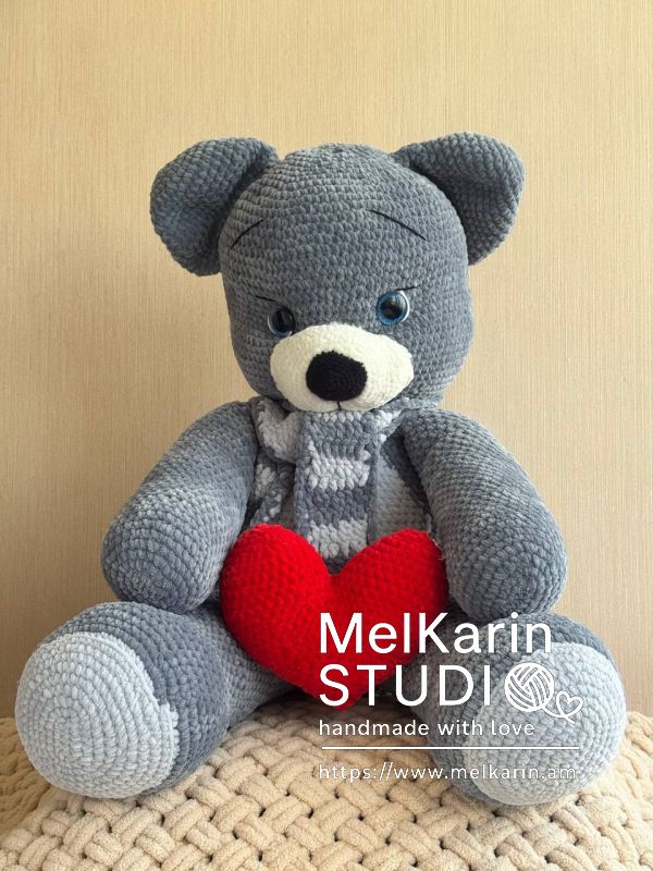 Большой плюшевый мишка ручной работы станет идеальным подарком для ваших близких. Сине-серый мягкий мишка держит в лапках яркое красное сердце, символ любви и нежности. Приятный на ощупь материал, выразительные глазки и милый образ делают его любимцем как для детей, так